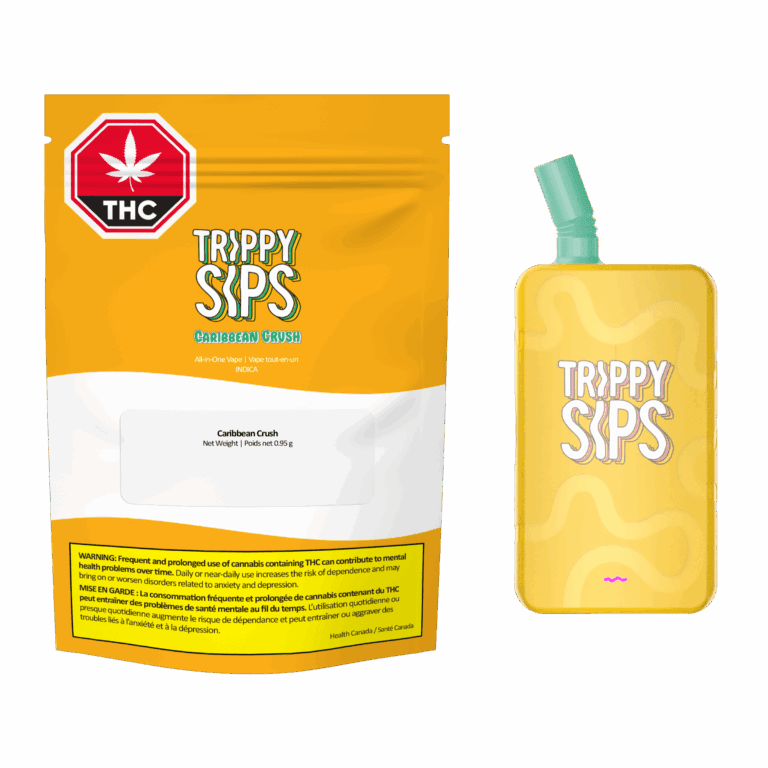 Trippy Sips’ discreet, palm-sized all-in-one vapes are here! Our innovative crinkle straw mouthpiece cools the vapour to give you bigger, better pulls every time. And this vape is rechargeable so you can savour the 0.95g of high potency THC distillate with the light and refreshing taste of tropical mangoes and pineapple in our Caribbean Crush flavour.