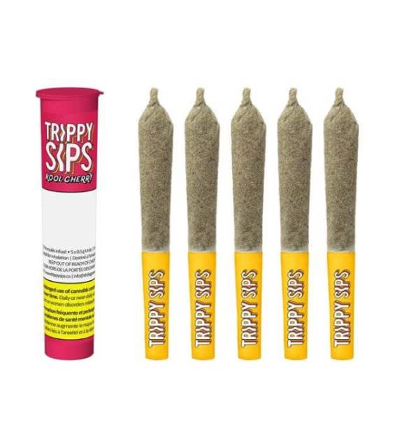 Enjoy the delicious cherry drink taste of Kool Cherry, now in Trippy Sips Infused Pre-rolls. This classic, refreshing flavour smokes like it was just poured from a frosty jug. Trippy Sips Infused Pre-Rolls are rolled with whole flower, mill-infused with high potency THC distillate, and then kief-coated for an extra kick on your tasty trip.