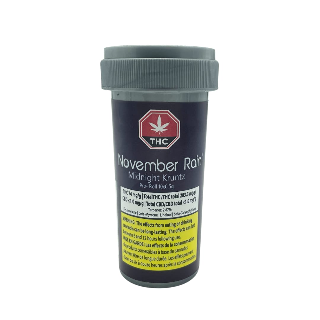 Each pack contains 10 pre-rolls, each weighing 0.5g, with our flower boasting over 2.5% terpenes and more than 26% THC for a potent and flavorful smoke. Midnight Kruntz is an exceptional indica-dominant strain that delights the senses with its sweet, gassy fragrance, enriched by hints of lemongrass and oak. November Rain’s pre-rolls offer the best of B.C.-grown cannabis, guaranteed to elevate your experience. Our flower is currently sourced from Abbey Leaf which excels in wonderfully cultivated flower with a great terpene profile and thc range for smokers both new and legacy alike.