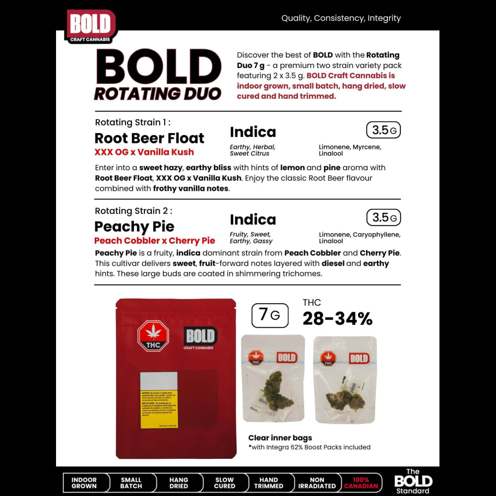 Discover the best of Bold with the Rotating Duo 7g – a premium two strain variety pack featuring 2 x 3.5g.
